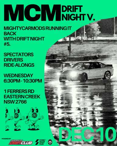 Mighty Car Mods is partnering with the Australian Drift Club so you can join us for the ultimate introduction to the thrilling world of drifting at the MCM Drift Night #5 - taking place on the Wet Skid Pan at Sydney Motorsport Park. Whether you’re a complete novice or just looking to refine your skills, this event is designed to provide a safe and exhilarating experience for first-time drifters and a good amount of skid time for those with more experience.